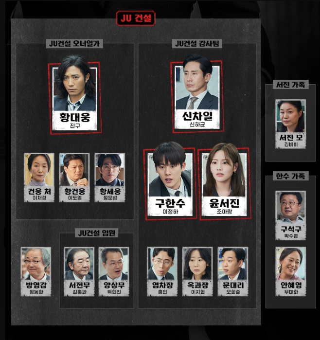 ●구한수 역(이정하): JU건설 감사팀 사원. 정 많고 감성적이여서 감사팀과 맞지 않는다는 평가를 받았지만, 끈기와 정의로움으로 감사팀장의 오른팔 역할을 해나갑니다.