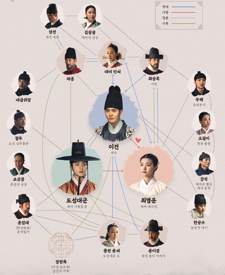 왕세자 이건을 중심으로 세자빈이 될 여인과의 로맨틱 라인과 그 안에 왕실의 권력을 향한 암투를 다루는 드라마 세자가 사라졌다 인물관계도입니다.