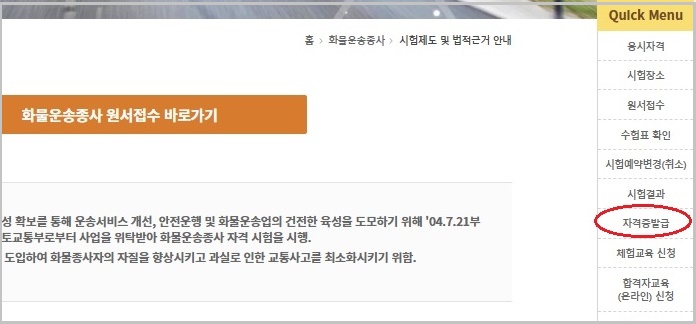 3. 오른쪽 Quick menu에 <자격증 발급> 항목을 선택합니다.